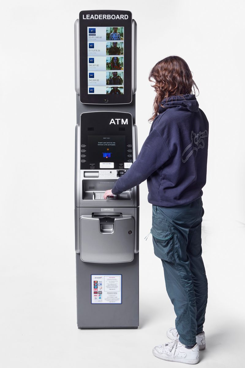 For the Perrotin booth at Art Basel Miami 2022, MSCHF modified an ATM to include a leaderboard. Upon using the ATM, users would be automatically photographed and listed on the leaderboard ranked by bank balance. Spectators hovered around the machine waiting to see who had what.
