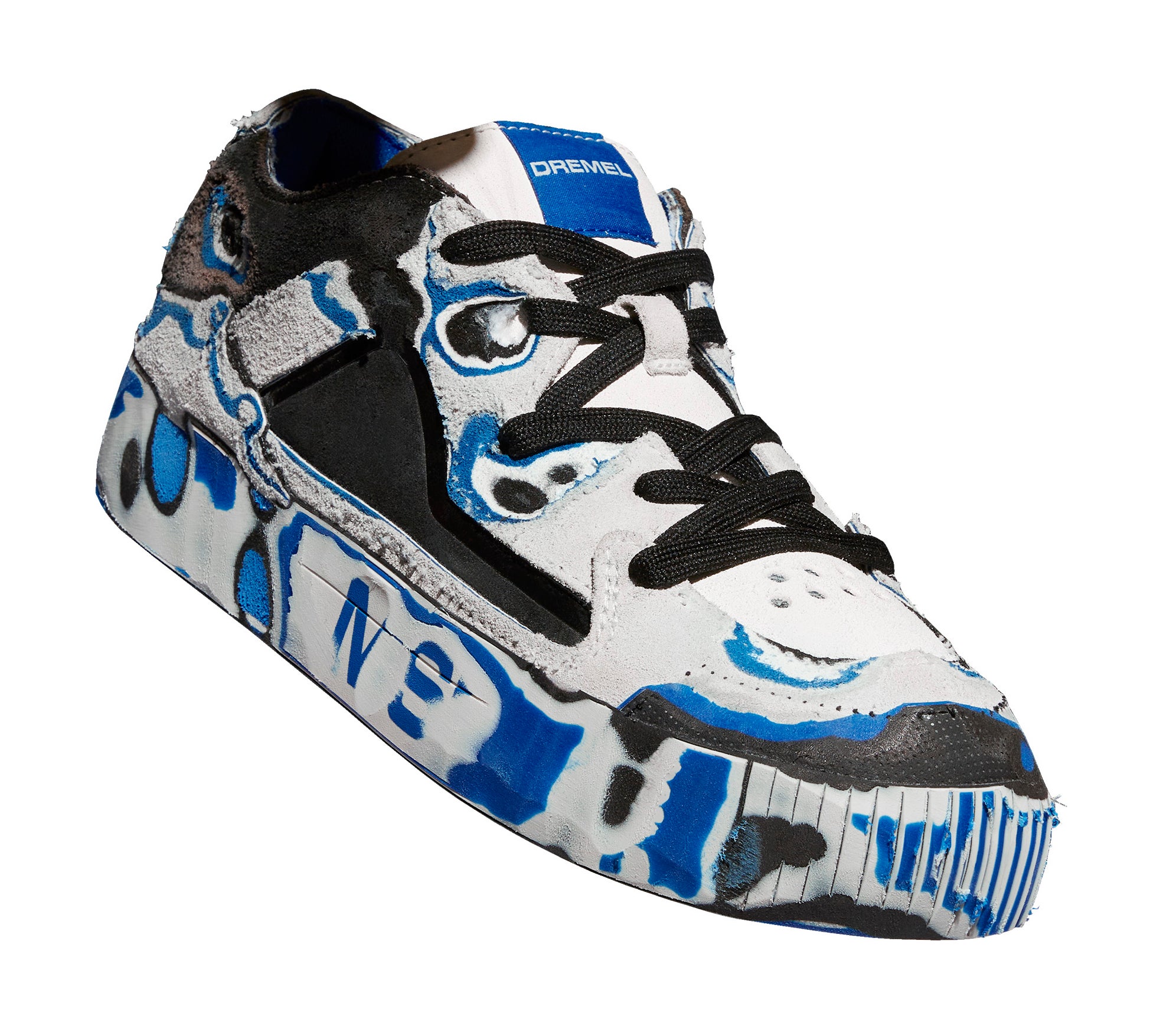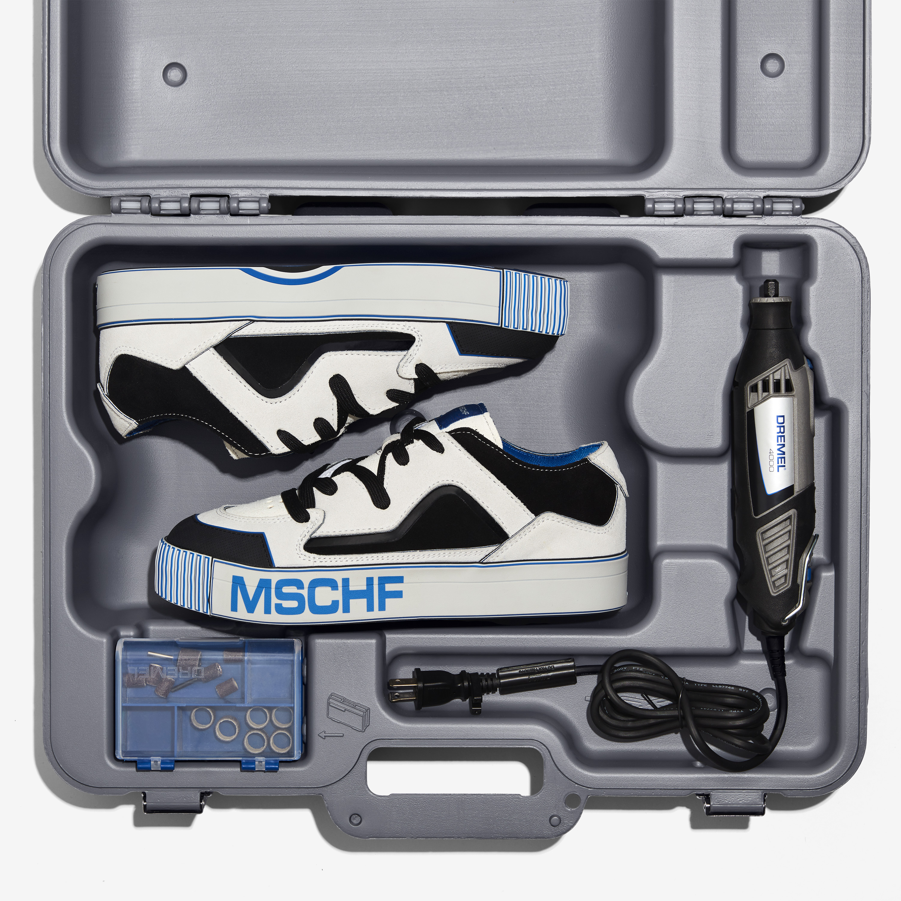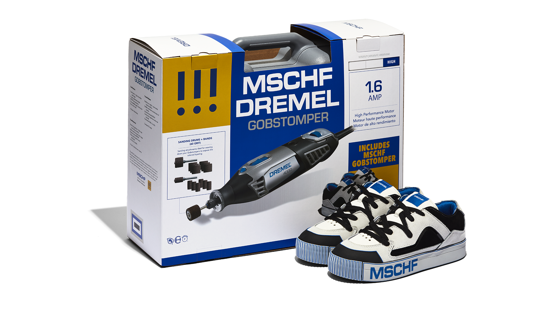Sneakers made to improve with wear. Inspired by skateboarding destroying shoes layer by layer. MSCHF created shoes with multiple colorful layers like a certain hard candy. When worn down with use, colors are exposed in ways unique to the pattern of wear. Originally released in collaboration with Jimmy Fallon and later with Dremel for a special edition which included a rotary tool kit.